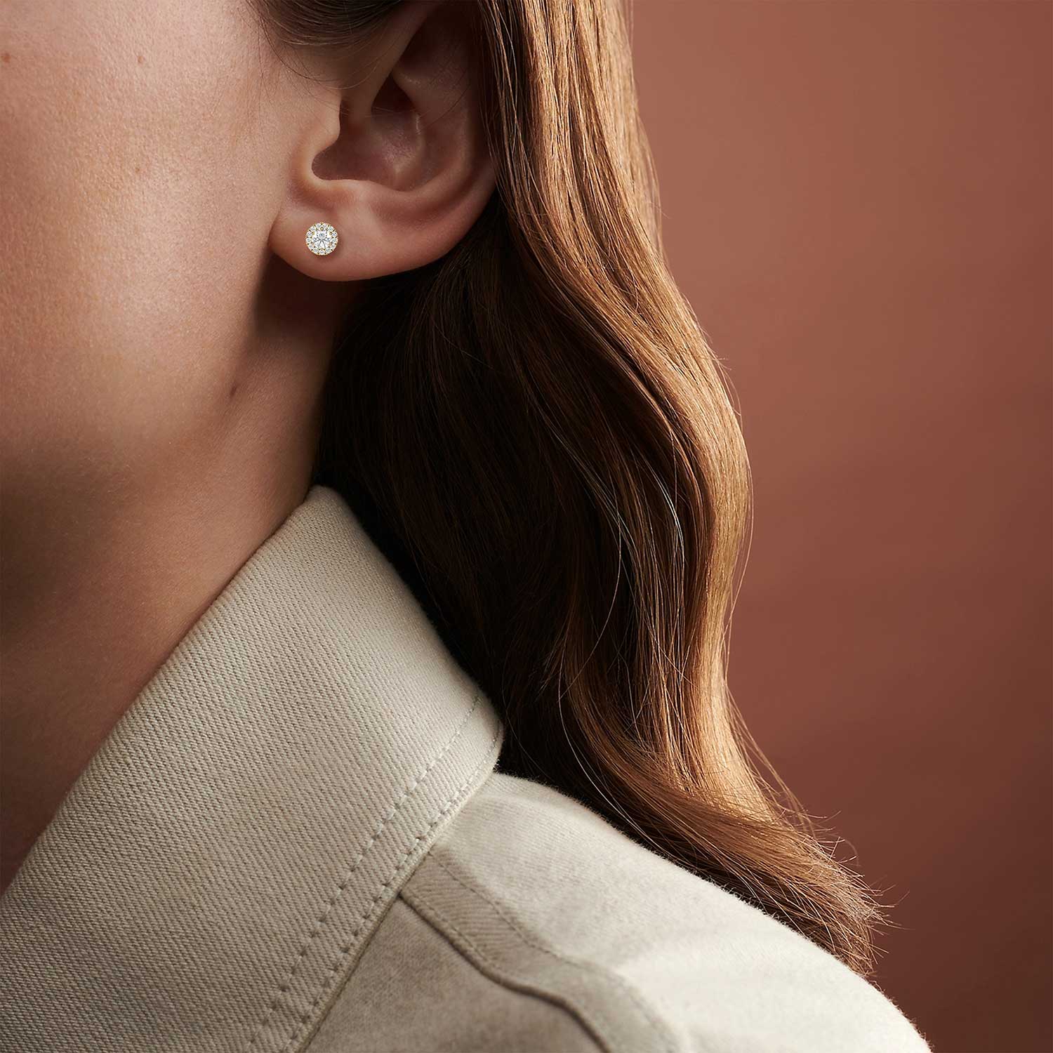 Halo style French-Set stud earrings with excellent cut diamonds providing maximum brilliance and superior scintillation.